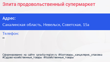 Элита, продовольственный супермаркет по адресу Сахалинская область, Невельск, Советская, 15а в дальнейшем Организация, размещена в следующих категориях: