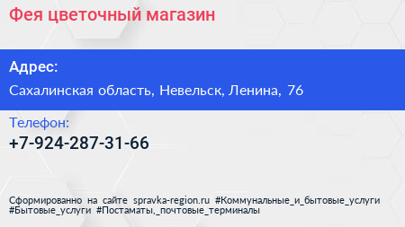 Фея, цветочный магазин по адресу Сахалинская область, Невельск, Ленина, 76 в дальнейшем Организация, размещена в следующих категориях: