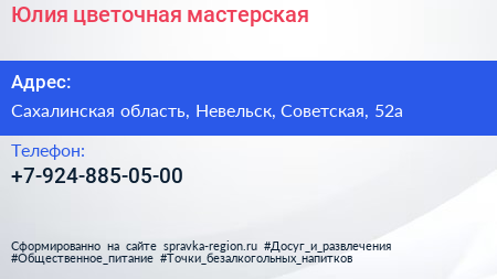 Юлия, цветочная мастерская по адресу Сахалинская область, Невельск, Советская, 52а в дальнейшем Организация, размещена в следующих категориях: