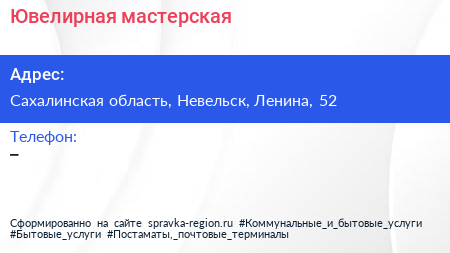 Ювелирная мастерская по адресу Сахалинская область, Невельск, Ленина, 52 в дальнейшем Организация, размещена в следующих категориях: