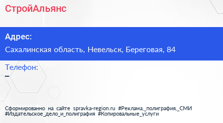 СтройАльянс по адресу Сахалинская область, Невельск, Береговая, 84 в дальнейшем Организация, размещена в следующих категориях: