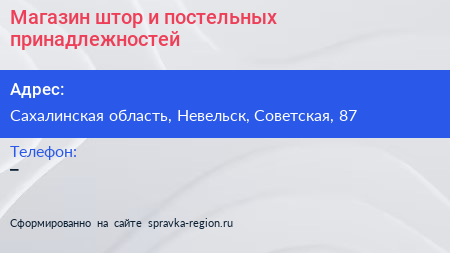 Магазин штор и постельных принадлежностей по адресу Сахалинская область, Невельск, Советская, 87 в дальнейшем Организация, размещена в следующих категориях: