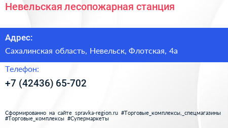Невельская лесопожарная станция по адресу Сахалинская область, Невельск, Флотская, 4а в дальнейшем Организация, размещена в следующих категориях: