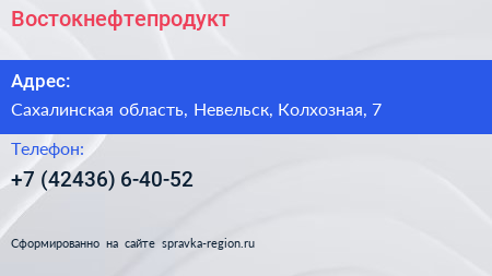 Востокнефтепродукт по адресу Сахалинская область, Невельск, Колхозная, 7 в дальнейшем Организация, размещена в следующих категориях: