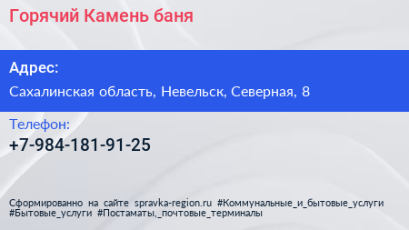 Горячий Камень, баня по адресу Сахалинская область, Невельск, Северная, 8 в дальнейшем Организация, размещена в следующих категориях: