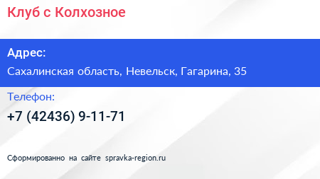 Клуб, с. Колхозное по адресу Сахалинская область, Невельск, Гагарина, 35 в дальнейшем Организация, размещена в следующих категориях: