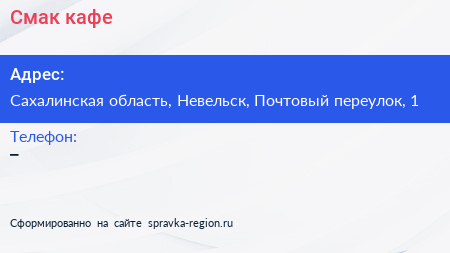 Смак, кафе по адресу Сахалинская область, Невельск, Почтовый переулок, 1 в дальнейшем Организация, размещена в следующих категориях: