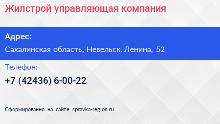 Жилстрой, управляющая компания по адресу Сахалинская область, Невельск, Ленина, 52 в дальнейшем Организация, размещена в следующих категориях:
