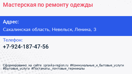 Мастерская по ремонту одежды по адресу Сахалинская область, Невельск, Ленина, 3 в дальнейшем Организация, размещена в следующих категориях: