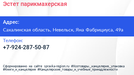 Эстет, парикмахерская по адресу Сахалинская область, Невельск, Яна Фабрициуса, 49а в дальнейшем Организация, размещена в следующих категориях: