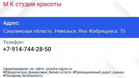 M & K, студия красоты по адресу Сахалинская область, Невельск, Яна Фабрициуса, 75 в дальнейшем Организация, размещена в следующих категориях: