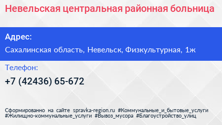 Невельская центральная районная больница по адресу Сахалинская область, Невельск, Физкультурная, 1ж в дальнейшем Организация, размещена в следующих категориях: