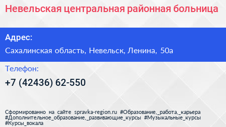 Невельская центральная районная больница по адресу Сахалинская область, Невельск, Ленина, 50а в дальнейшем Организация, размещена в следующих категориях: