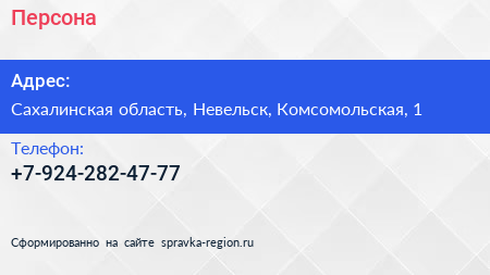 Персона по адресу Сахалинская область, Невельск, Комсомольская, 1 в дальнейшем Организация, размещена в следующих категориях:
