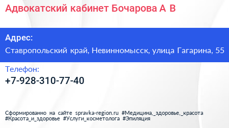 Адвокатский кабинет Бочарова А.В. по адресу Ставропольский край, Невинномысск, улица Гагарина, 55 в дальнейшем Организация, размещена в следующих категориях: