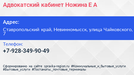 Адвокатский кабинет Ножина Е.А. по адресу Ставропольский край, Невинномысск, улица Чайковского, 7 в дальнейшем Организация, размещена в следующих категориях: