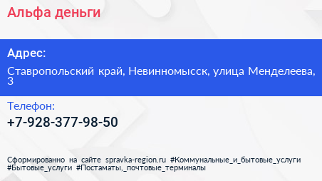 Альфа деньги по адресу Ставропольский край, Невинномысск, улица Менделеева, 3 в дальнейшем Организация, размещена в следующих категориях: