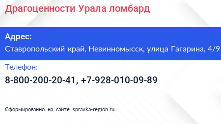 Драгоценности Урала, ломбард по адресу Ставропольский край, Невинномысск, улица Гагарина, 4/9 в дальнейшем Организация, размещена в следующих категориях: