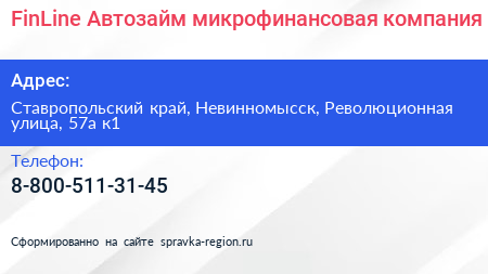 FinLine-Автозайм, микрофинансовая компания по адресу Ставропольский край, Невинномысск, Революционная улица, 57а к1 в дальнейшем Организация, размещена в следующих категориях: