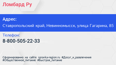 Ломбард Ру по адресу Ставропольский край, Невинномысск, улица Гагарина, 85 в дальнейшем Организация, размещена в следующих категориях: