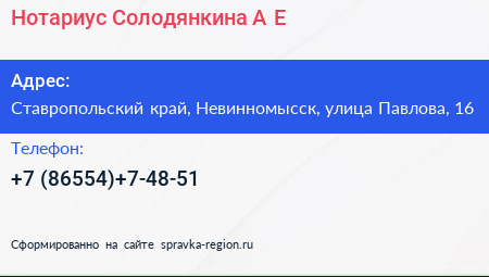 Нотариус Солодянкина А.Е по адресу Ставропольский край, Невинномысск, улица Павлова, 16 в дальнейшем Организация, размещена в следующих категориях: