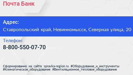 Почта Банк по адресу Ставропольский край, Невинномысск, Северная улица, 20 в дальнейшем Организация, размещена в следующих категориях: