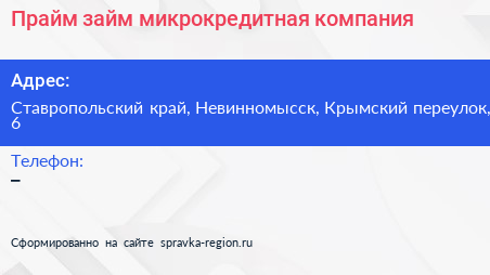 Прайм займ, микрокредитная компания по адресу Ставропольский край, Невинномысск, Крымский переулок, 6 в дальнейшем Организация, размещена в следующих категориях: