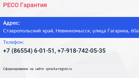 РЕСО-Гарантия по адресу Ставропольский край, Невинномысск, улица Гагарина, 60а в дальнейшем Организация, размещена в следующих категориях:
