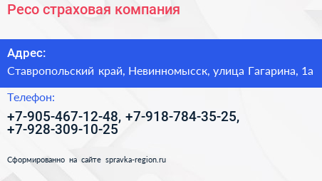 Ресо, страховая компания по адресу Ставропольский край, Невинномысск, улица Гагарина, 1а в дальнейшем Организация, размещена в следующих категориях: