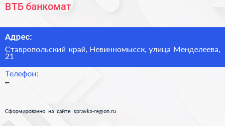 ВТБ, банкомат по адресу Ставропольский край, Невинномысск, улица Менделеева, 21 в дальнейшем Организация, размещена в следующих категориях: