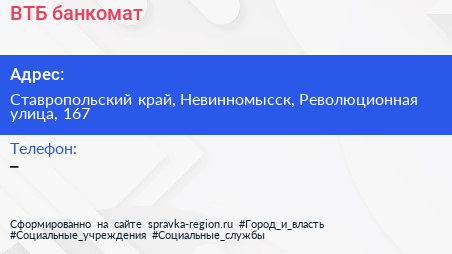 ВТБ, банкомат по адресу Ставропольский край, Невинномысск, Революционная улица, 167 в дальнейшем Организация, размещена в следующих категориях: