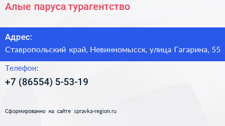 Алые паруса, турагентство по адресу Ставропольский край, Невинномысск, улица Гагарина, 55 в дальнейшем Организация, размещена в следующих категориях: