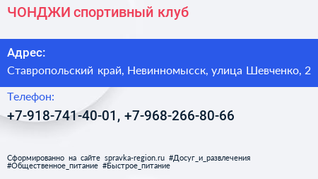 ЧОНДЖИ, спортивный клуб по адресу Ставропольский край, Невинномысск, улица Шевченко, 2 в дальнейшем Организация, размещена в следующих категориях: