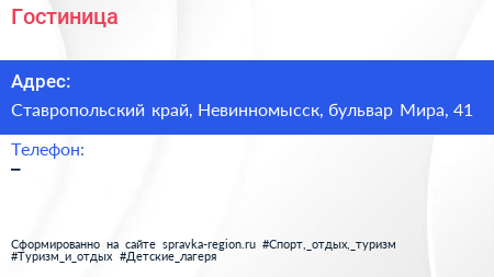 Гостиница по адресу Ставропольский край, Невинномысск, бульвар Мира, 41 в дальнейшем Организация, размещена в следующих категориях: