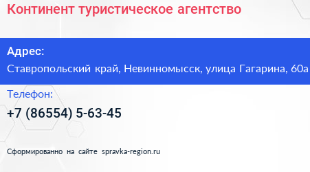 Континент, туристическое агентство по адресу Ставропольский край, Невинномысск, улица Гагарина, 60а в дальнейшем Организация, размещена в следующих категориях: