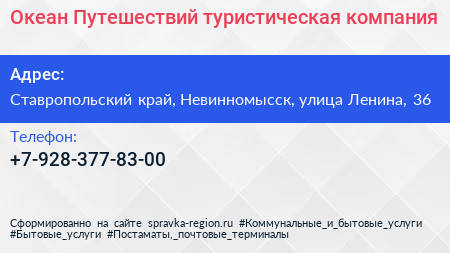 Океан Путешествий, туристическая компания по адресу Ставропольский край, Невинномысск, улица Ленина, 36 в дальнейшем Организация, размещена в следующих категориях: