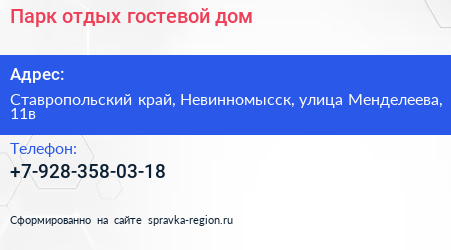 Парк отдых, гостевой дом по адресу Ставропольский край, Невинномысск, улица Менделеева, 11в в дальнейшем Организация, размещена в следующих категориях: