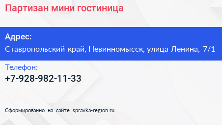 Партизан, мини-гостиница по адресу Ставропольский край, Невинномысск, улица Ленина, 7/1 в дальнейшем Организация, размещена в следующих категориях: