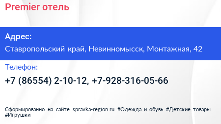 Premier, отель по адресу Ставропольский край, Невинномысск, Монтажная, 42 в дальнейшем Организация, размещена в следующих категориях: