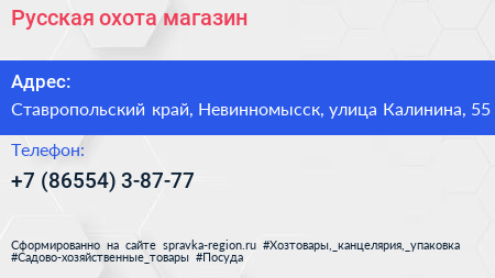 Русская охота, магазин по адресу Ставропольский край, Невинномысск, улица Калинина, 55 в дальнейшем Организация, размещена в следующих категориях: