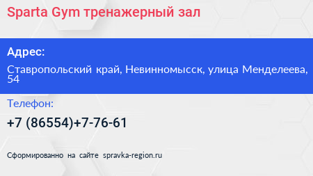 Sparta Gym, тренажерный зал по адресу Ставропольский край, Невинномысск, улица Менделеева, 54 в дальнейшем Организация, размещена в следующих категориях: