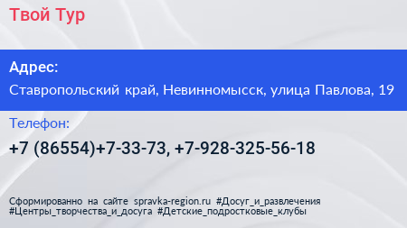 Твой Тур по адресу Ставропольский край, Невинномысск, улица Павлова, 19 в дальнейшем Организация, размещена в следующих категориях: