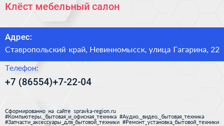 Клёст, мебельный салон по адресу Ставропольский край, Невинномысск, улица Гагарина, 22 в дальнейшем Организация, размещена в следующих категориях: