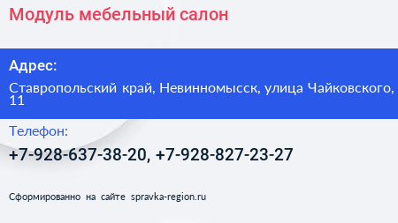 Модуль, мебельный салон по адресу Ставропольский край, Невинномысск, улица Чайковского, 11 в дальнейшем Организация, размещена в следующих категориях: