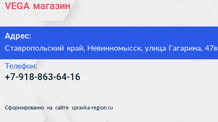 VEGA, магазин по адресу Ставропольский край, Невинномысск, улица Гагарина, 47в в дальнейшем Организация, размещена в следующих категориях: