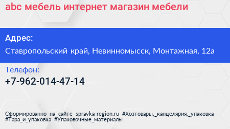 abc мебель, интернет-магазин мебели по адресу Ставропольский край, Невинномысск, Монтажная, 12а в дальнейшем Организация, размещена в следующих категориях: