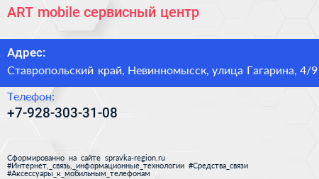 ART mobile, сервисный центр по адресу Ставропольский край, Невинномысск, улица Гагарина, 4/9 в дальнейшем Организация, размещена в следующих категориях: