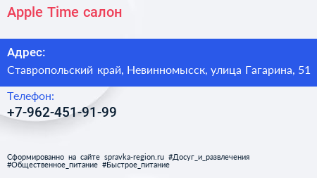 Apple Time, салон по адресу Ставропольский край, Невинномысск, улица Гагарина, 51 в дальнейшем Организация, размещена в следующих категориях: