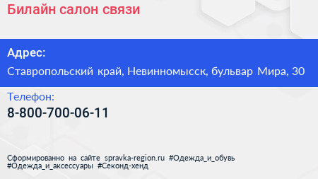 Билайн, салон связи по адресу Ставропольский край, Невинномысск, бульвар Мира, 30 в дальнейшем Организация, размещена в следующих категориях: