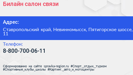 Билайн, салон связи по адресу Ставропольский край, Невинномысск, Пятигорское шоссе, 11 в дальнейшем Организация, размещена в следующих категориях: